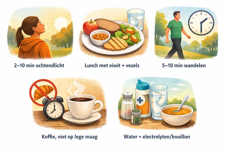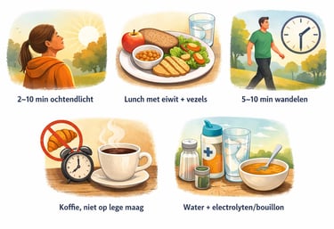 Snelle fix: vaste wektijd + meer ochtendlicht (2–10 minuten buiten) helpt vaak meer dan extra koffie.